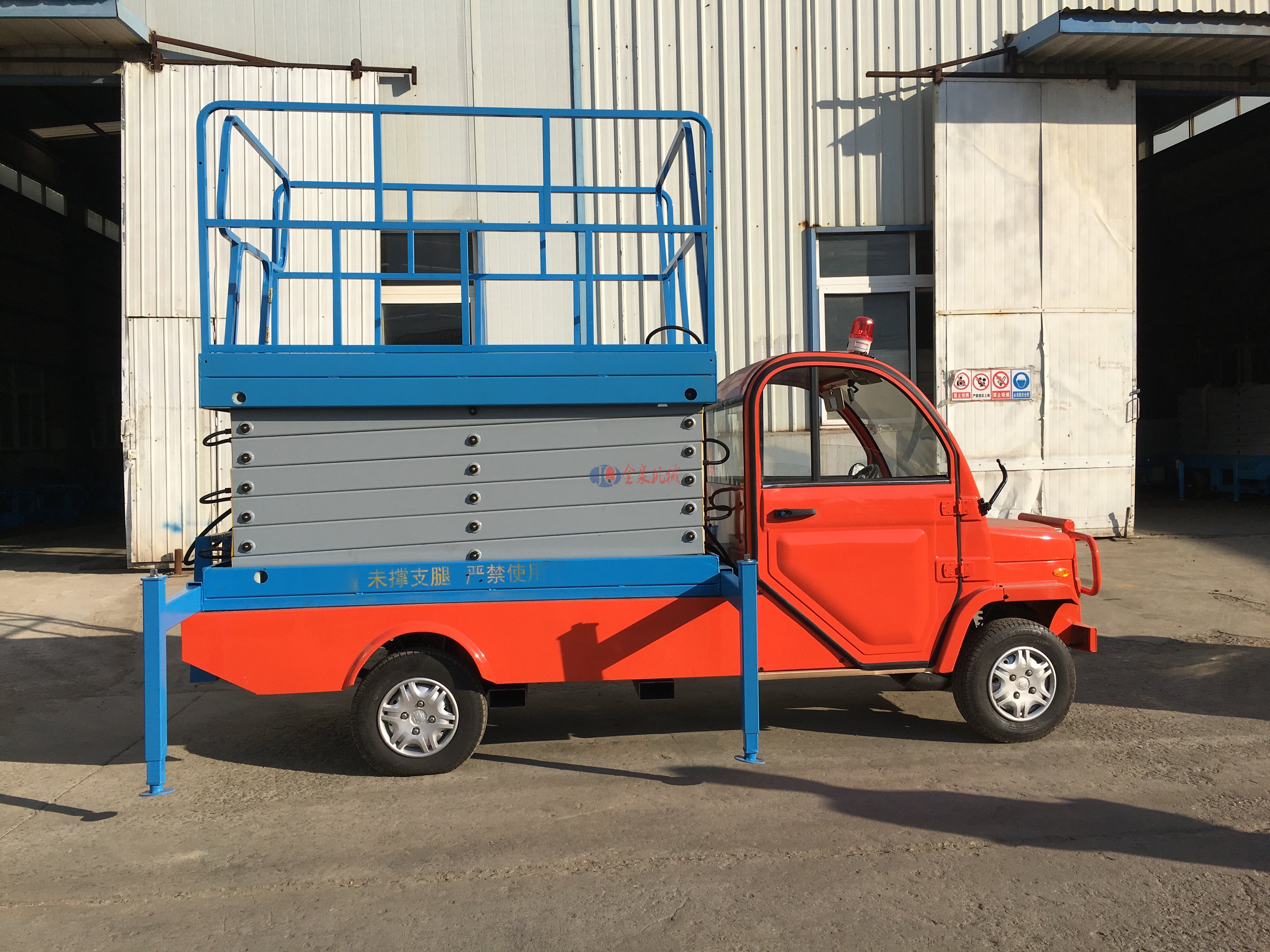 車載剪叉式升降機(jī):集四輪移動與二輪牽引于一身,采用汽車、三輪車或電瓶車底盤做平臺底 架,利用本車發(fā)動機(jī)或直流電做動力,既可行駛又可驅(qū)動平臺升降,廣泛用于城建、油田、交通、市政、廠區(qū)等行業(yè)的高空作業(yè)。