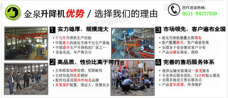 收藏金泉|網(wǎng)站地圖|聯(lián)系我們歡迎訪問(wèn)濟(jì)南金泉升降機(jī)械有限公司官方網(wǎng)站!本公司主導(dǎo)產(chǎn)品有升降貨梯,移動(dòng)升降機(jī),斜掛升降機(jī),無(wú)障礙升降平臺(tái),傳菜升降機(jī),自行升降平臺(tái),鋁合金升降機(jī),移動(dòng)升降平臺(tái),移動(dòng)登車橋