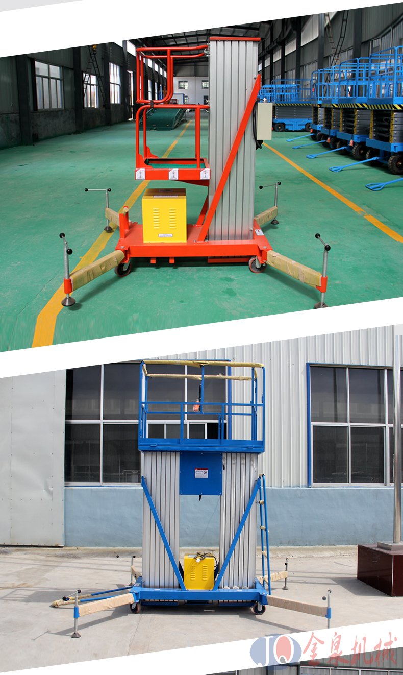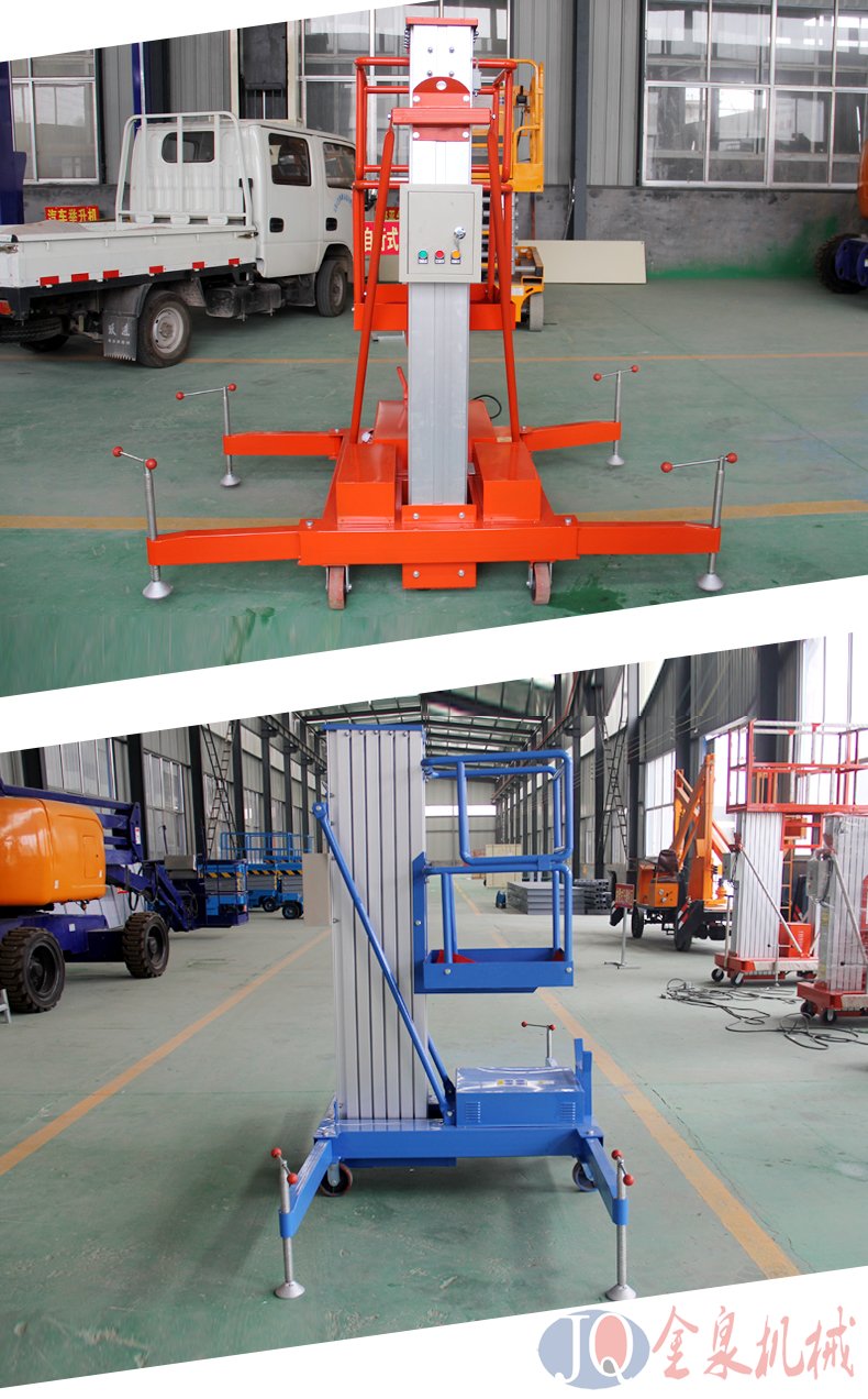 單柱鋁合金升降機(jī):該系列產(chǎn)品為室內(nèi)型,廣泛適用于星級酒店,大型超市等各行業(yè)大廳、廠房內(nèi)的高空作業(yè), 具有升降平衡,操作方便,能進(jìn)入一般門廳,可隨意進(jìn)出電梯且耗電少、無污染、工作時(shí)不傷 地面,可用于貼墻工作及探出作業(yè),工作無死角。單立柱式鋁合金電動(dòng)升降機(jī)配上龍門跨架附件,非常適合于影劇院、會堂、教堂等的維修工作。該龍門跨架組裝容易,操作省力,移動(dòng)靈活,可跨越高度達(dá)1.1m的固定座椅等障礙物,并可在臺階上穩(wěn)定 作業(yè)。 高強(qiáng)度矩形鋼管制作, 剛性、穩(wěn)定性好。 配有萬向腳輪,機(jī)動(dòng)靈活。 兩端架跨距可調(diào),能適 用于跨越不同障礙物的要求。 兩端架垂直可調(diào),可用于一定坡度的斜面或臺階上作業(yè)。